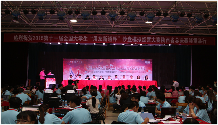 “创新放飞梦想 创业成就未来”,由教育部工商管理类学科专业教学指导委员会指导、中国高等教育学会高等财经教育分会、中国职业技术教育学会商科专业委员会主办,西安交通大学管理学院协办,西安理工大学与用友新道科技有限公司共同承办的2015年第十一届全国大学生“用友新道杯”沙盘模拟经营大赛陕西省总决赛于6月27日在西安理工大学曲江校区大学生活动中心成功举行。出席本次大赛开幕的有:陕西省教育厅高教处、用友新道陕西分公司、西安交通大学、西安电子科技大学、西安理工大学等相关领导与负责人。